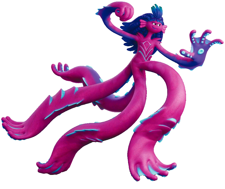 In her giant kraken form, Agatha has 6 tentacles (2 arms and 4 legs) with 4 fingers on each, pink glowing skin, and small spots all around her body to resemble a symmetrical design, small spiky shoulder pads and longer hair.[1]