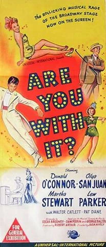 Are You With It? is a 1948 American musical comedy film about a young insurance man who quits his job to join a traveling carnival. The film is based on the 1945 Broadway musical of the same name and the novel Slightly Perfect by George Malcolm-Smith. The film stars Donald O'Connor, Olga San Juan, Martha Stewart and Lew Parker. Parker reprised his role from the musical.