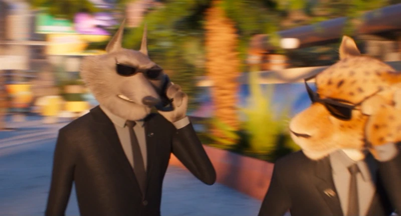 The leopard guard has light brown fur with dark brown spots. The wolf has gray fur. They both wear identical black suits and sunglasses.