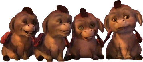 The Dronkeys are characters in the Shrek franchise. They are Donkey and Dragon's children and Shrek, Puss in Boots, and Fiona's adoptive nephews and nieces.
