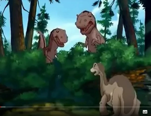 The sharpteeth first appear at the beginning of Rhett's story. They encounter his Longneck herd and move in, but are stopped by Rhett. He uses pebbles to fight them off by launching them at the face of the sharpteeth. Eventually they back down and run away, saving the herd. They appear next in the following story, and this time they are shown to be chasing the herd through a redwood forest. Rhett again stops them, and uses his tail to chop down the huge trees. This blocks the sharpteeth's paths off, and once again the Longneck herd is safe from them.
