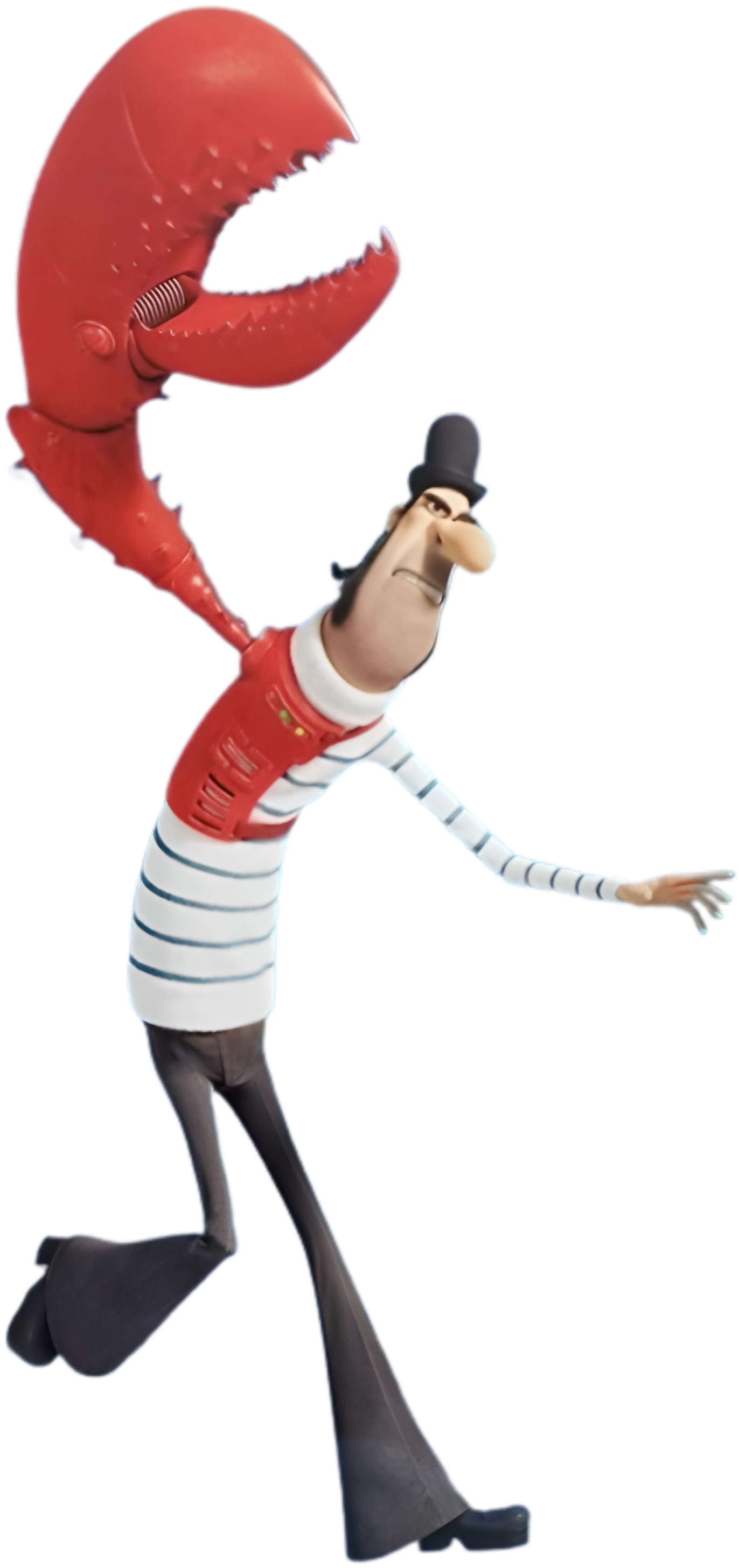 Jean-Clawed is a fair-skinned man with medium-length hair, sideburns, and stubble. He wears a Breton-striped shirt with flared pants and a bowler hat. His most striking feature though is his red mechanical crab arm which replaces his right.