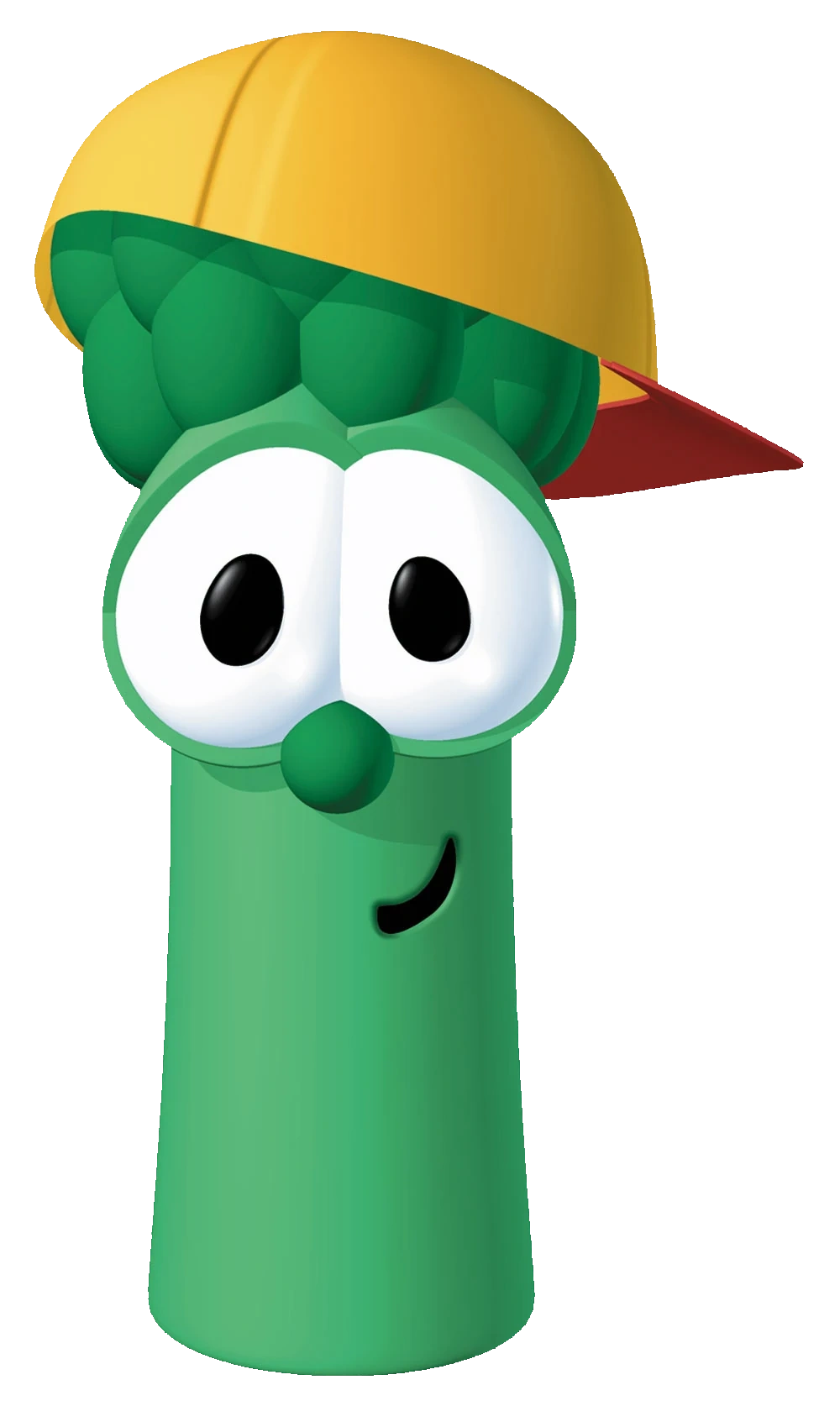 Junior is a green little asparagus. He has large child-like eyes and a tiny green nose. He has a small green spear atop his head, which is usually covered by a yellow baseball cap with a red brim. In later appearances, he intermittently starts to wear a tan and red striped polo shirt. Junior often smiles and speaks out of the side of his mouth, especially when he's feeling or acting sheepish.