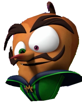 He appeared as a potato with long nose, a mustache and thick eyebrows. His eyes also appeared asymmetrical in size, since his left eye is bigger, but his right eye has a bigger pupil. His pupils also have different colors from each other. His right is green, while his left is pink. He also appeared to have his green villainous suit with vertical stripes. He also has an "M" on his belt buckle, likely stands for his name.