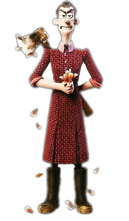 Mrs. Tweedy then wakes up again and goes off to pursue the escaping chickens, now insanely mad, wielding the axe as the chickens are flying in their plane. Ginger tricks Mrs. Tweedy into cutting the rope with her axe, and she lands in the safety valve of the pie machine, making it explode. At that rate, Mr. Tweedy (who just untied himself) told his wife for not coming to the fact that the chickens were organized in the first place. This only enrages Mrs. Tweedy, who growls at him in anger, but having enough, Mr. Tweedy pushes the doors down on her, finally one-upping his wife.