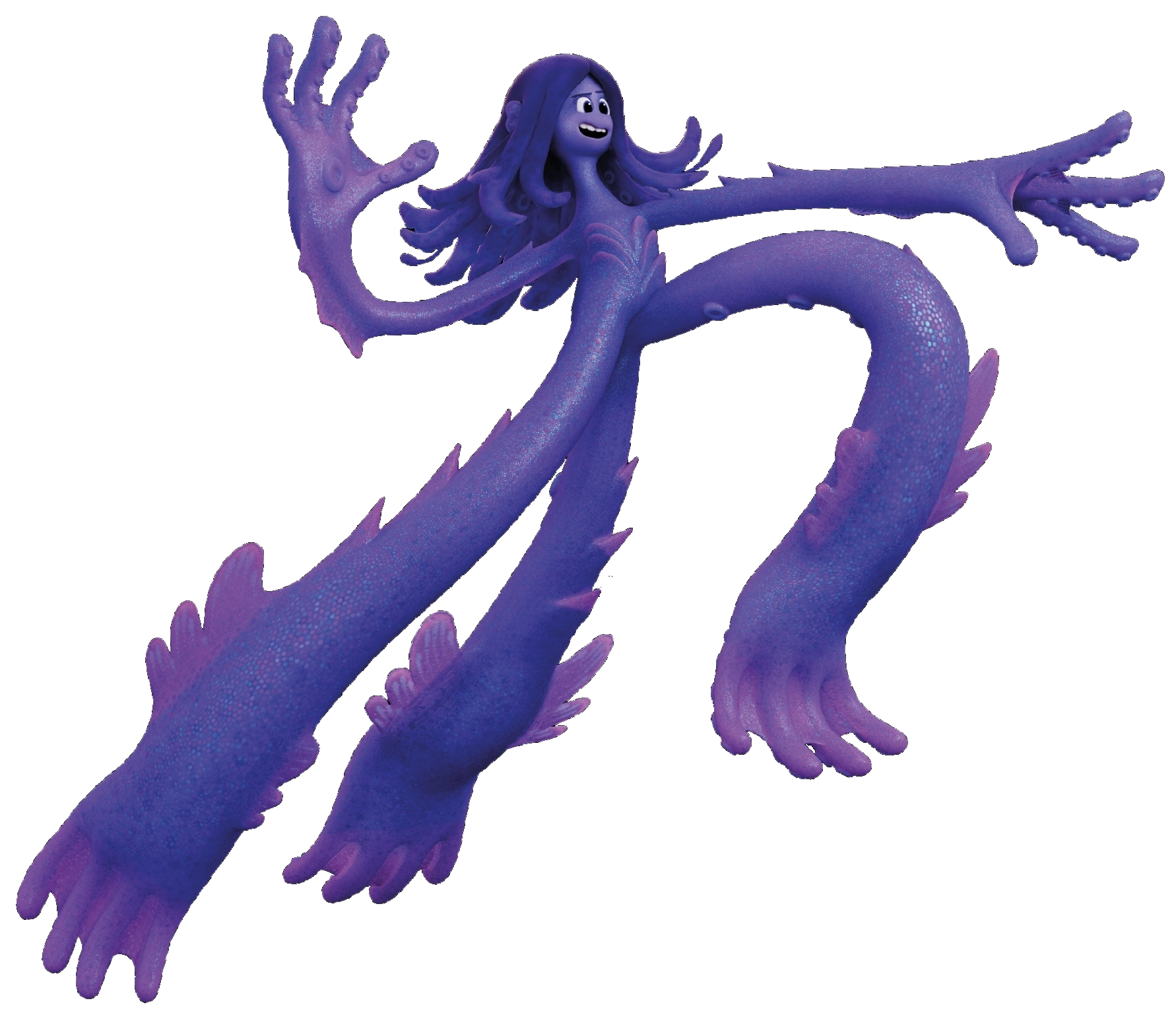 When exposed to ocean water, Ruby transforms into a giant kraken. In this form, her skin changes to purple, having a slight sparkling texture present throughout most of her body. Her hair is also affected by the transformation, getting longer in length, suckers that now line the inner parts, and having small, glowing strips in-between each lock. Ruby’s ears are larger, a visible sparkling gradient prominent on the ends. Her eyes become a vibrant purple, with her eyelashes being a darker coloration. On her now webbed hands and feet, the suckers are always visible, albeit lacking a glow. On her torso, she has six fins that jut upwards, with three on each side, resembling a ribcage. Her upper arms and legs gain three spikes on each, with her lower limbs now having pelvic fins that protrude from the outer sides for stability. Ruby’s most distinguishing trait in this form, besides her size, is the extra leg, which has the same appearance as the other two. This extra appendage also aids in movement throughout the seven seas.